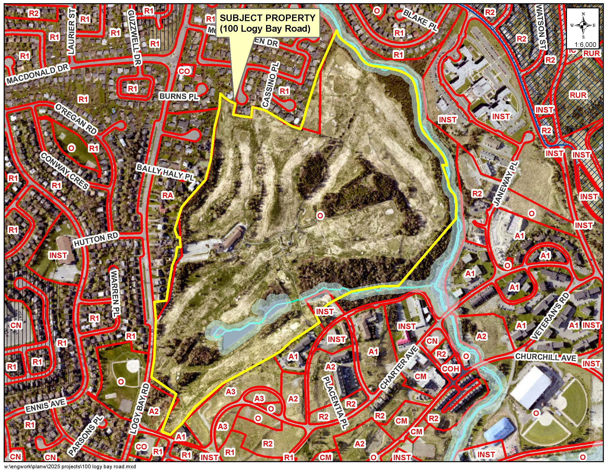 The City received an application from KMK Capital Inc. to rezone 100 Logy Bay Road (the former Bally Haly golf course) from the Open Space (O) Zone to the Planned Mixed Development (PMD) Zone to enable a large mixed-use neighbourhood development.